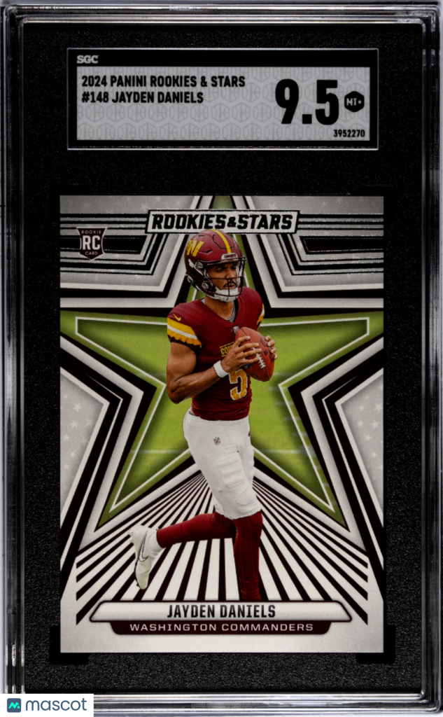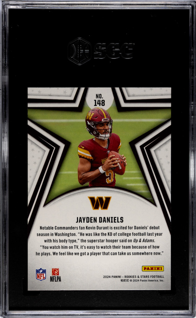 You are purchasing a 2024 Panini Rookies & Stars Jayden Daniels #148 Rookie Washington Commanders SGC 9.5. You will receive the exact item in the photographs. Thank you for looking.