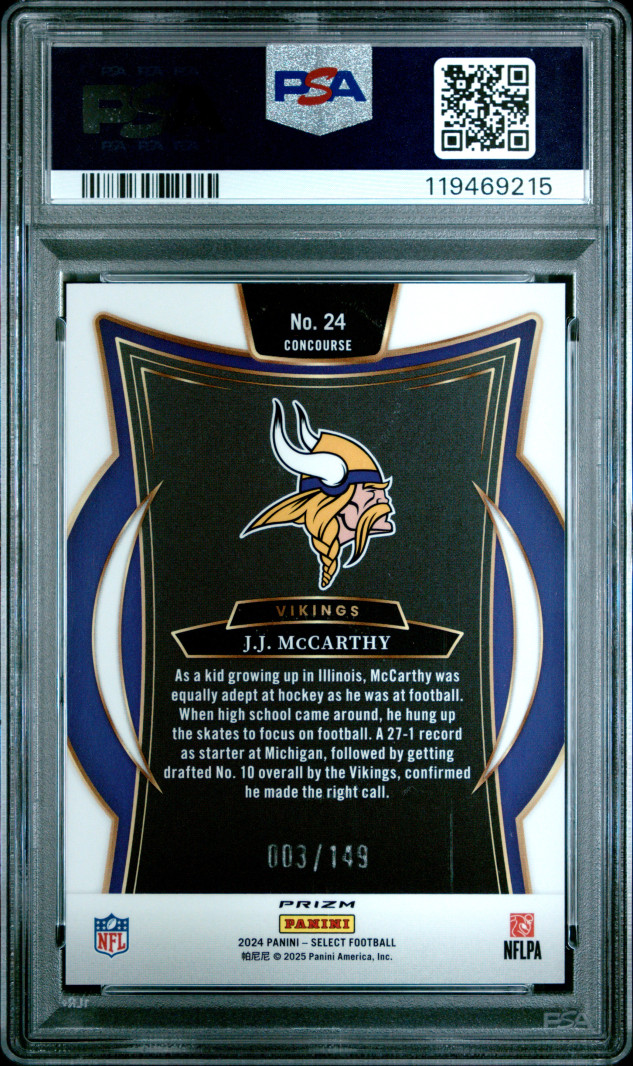You are purchasing a 2024 Panini Select JJ Mccarthy #24 PSA 10. You will receive the exact item in the photographs. Thank you for looking.