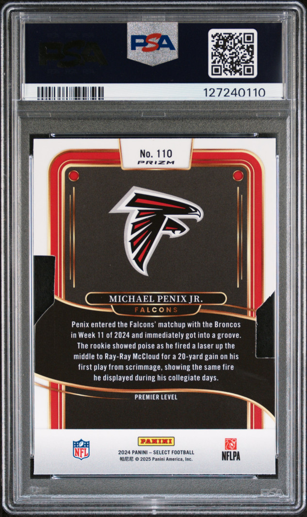The 2024 Panini Select Premier Level Michael Penix Jr. #110 Silver Prizm Die-Cut RC is a highly sought-after sports trading card featuring the rookie player from the Atlanta Falcons. Graded as an 8 by Professional Sports Authenticator (PSA), this card is part of the Panini Select set for the National Football League (NFL) season. The die-cut design and silver prizm finish add rarity and value to this collectible item for fans of football and trading card enthusiasts alike.