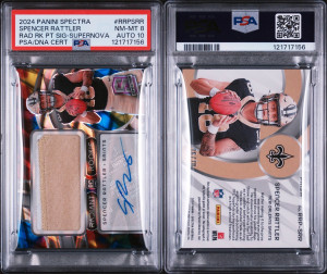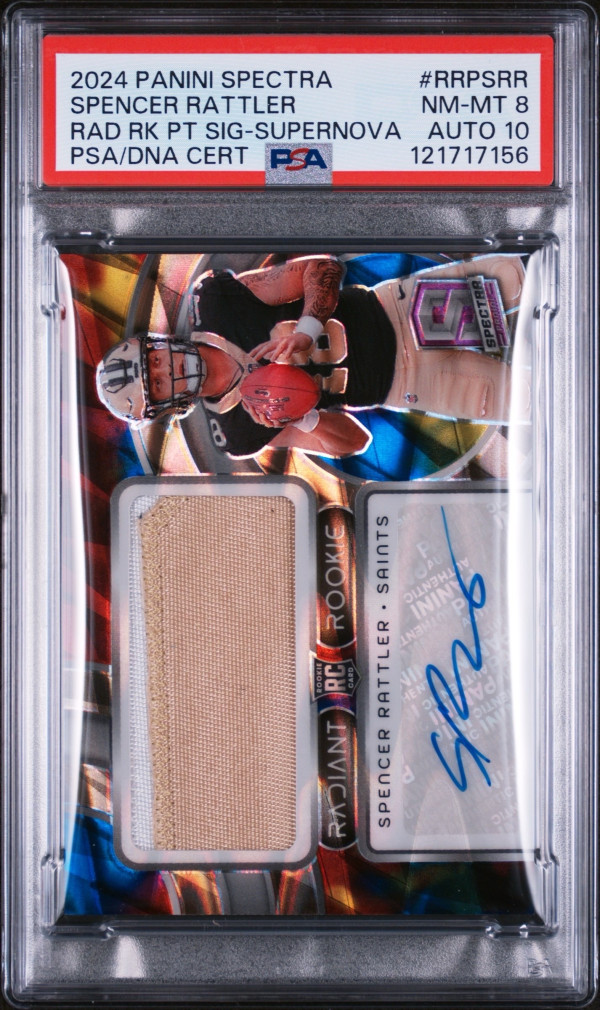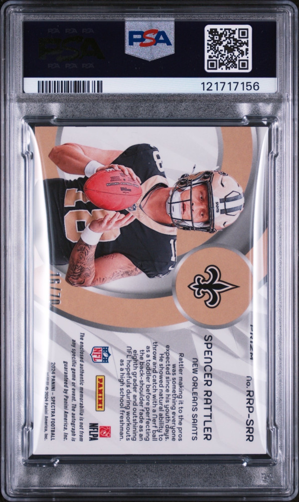 The product is a 2024 Panini Spectra trading card featuring Spencer Rattler, an autographed patch with a PSA Auto 10 grade. This sports trading card is part of the Panini Authentic autograph authentication set and is officially licensed by the National Football League (NFL). The card is made of card stock and is an original, not a reprint, with a label or sticker autograph format. It is a unique collectible for football fans and collectors alike.