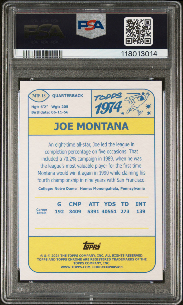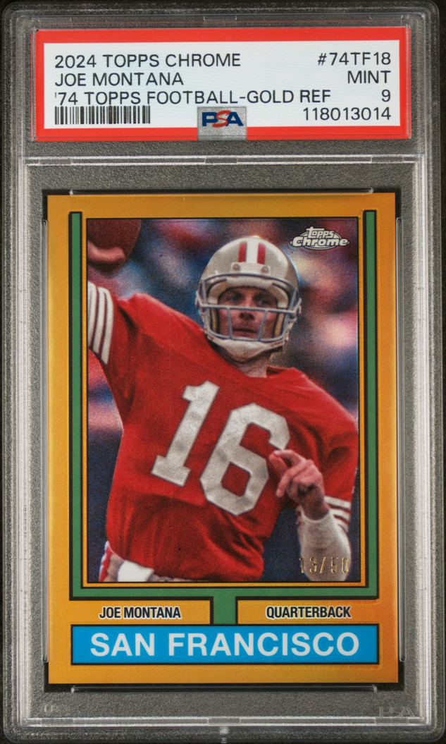 2024 TOPPS CHROME 1974 TOPPS GOLD REFRACTOR #74TF19 JOE MONTANA (13/50) PSA 9