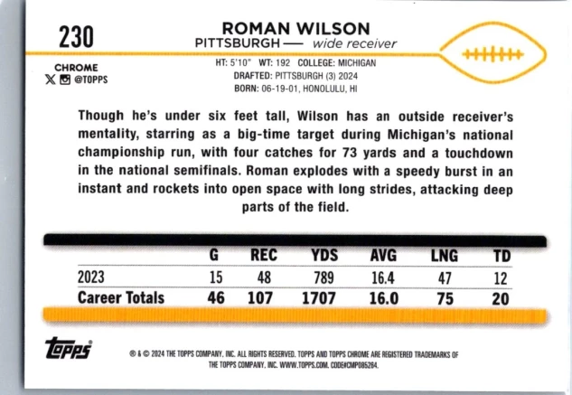 In 2024 Roman Wilson played for the Pittsburgh Steelers.