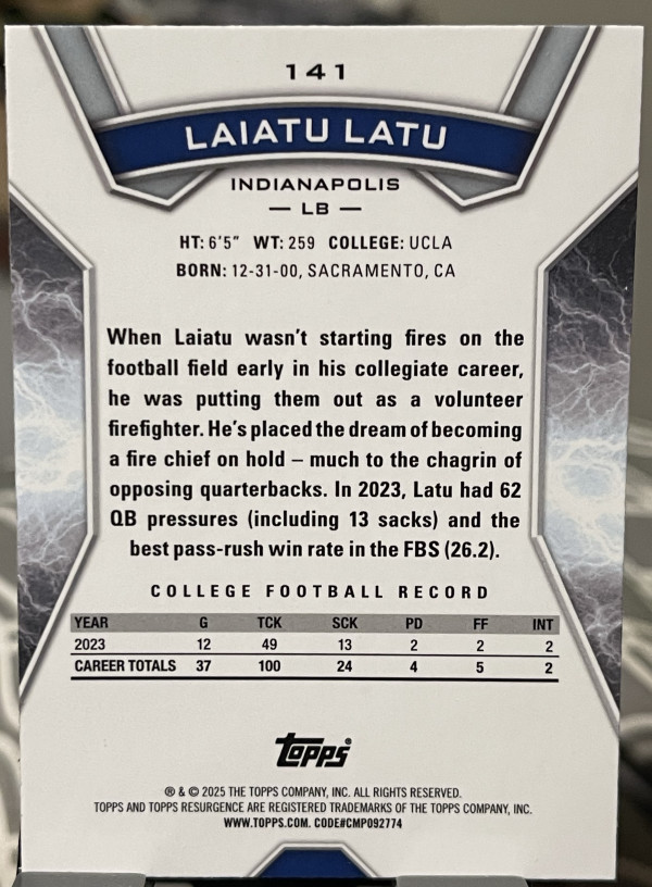 2024 Topps Resurgence - Rookies Laiatu Latu #141 Sky Blue & Pink Shock Refractor (RC)