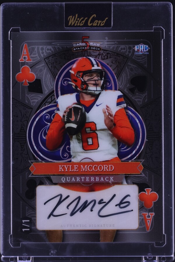 The product is a 2024 Wild Card 5 Cad Draw Clubs Black Kyle McCord Rookie Auto 1/1 trading card featuring an autograph from the player. This card is a unique, one-of-a-kind collectible for football fans, especially those interested in the National Collegiate Athletic Association (NCAA) league. The card is made of high-quality card stock with a thickness of 35 Pt. and is a standard size for sports trading cards. It is an original release from the manufacturer, Wild Card, and includes special features as a rookie card from the Syracuse Orange team in the 2024 season.