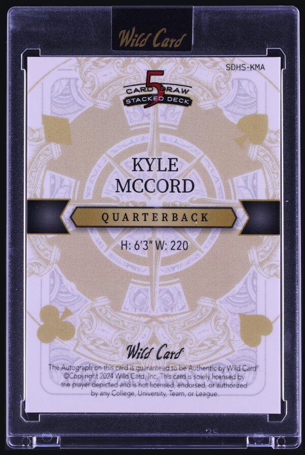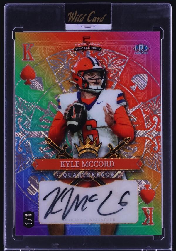 The product is a 2024 Wild Card 5 Cad Draw Spades Tie Dye Kyle McCord ROOKIE AUTO 1/1 trading card featuring football player Kyle McCord. As a 1/1 card, it is a unique and rare collectible item for fans and collectors. The tie-dye design adds a special visual element to the card, making it stand out in any collection. Produced by Wild Card, a well-known manufacturer in the sports trading card industry, this card is a valuable addition for enthusiasts of football trading cards, especially for those interested in rookie athletes like Kyle McCord.