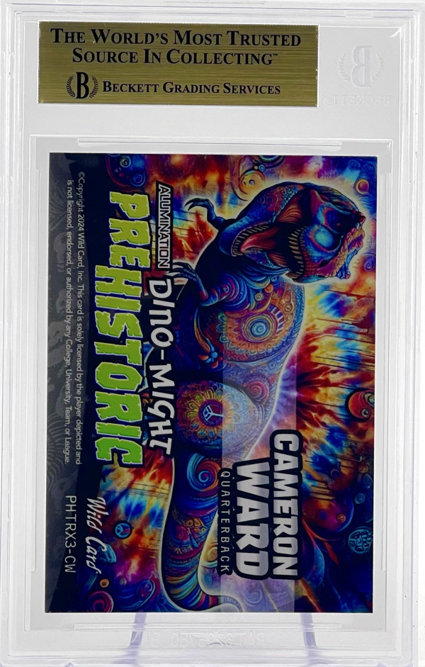 The product is a 2024 Wild Card prehistoric Trex football trading card featuring Cameron Ward from the National Collegiate Athletic Association (NCAA). This standard-sized card is made of card stock with a thickness of 35 Pt. It is an original release from the manufacturer Wild Card and authenticated by Noah Song with a label or sticker autograph. The card is graded as a 9.5 by Beckett Grading Services (BGS) and showcases a laser blue design, making it a unique addition to any sports trading card collection.