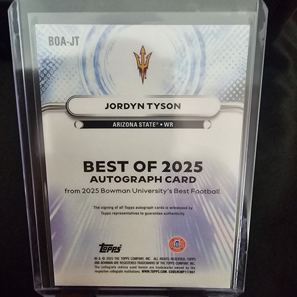 The product is a 2025 Bowman University Best trading card featuring an autograph from Jordyn Tyson, a player from the Arizona State Sun Devils football team. This particular card is part of the "Best Of 2025 Autographs Green Mini-Diamond" subset, with a limited edition serial number of #26/99. The card is in English and manufactured by Bowman, making it a highly collectible item for fans and collectors of sports trading cards