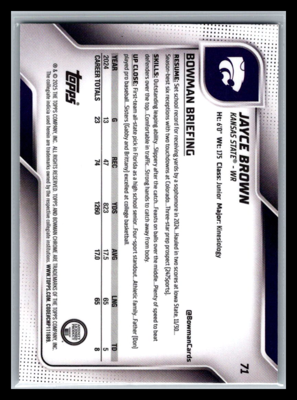 You are purchasing a 2025 Topps Bowman Chrome University Jayce Brown #71 Green Mini-Diamond Parallel/Variety 16/99 Kansas State Wildcats. You will receive the exact item in the photographs. Thank you for looking.