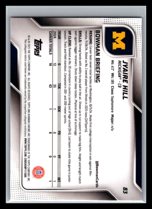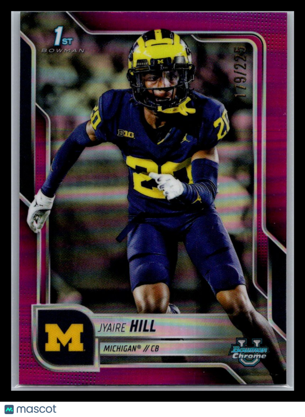 You are purchasing a 2025 Bowman University Chrome Jyaire Hill #83 Fucshia 179/225 Parallel/Variety Michigan Wolverines. You will receive the exact item in the photographs. Thank you for looking.