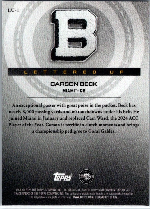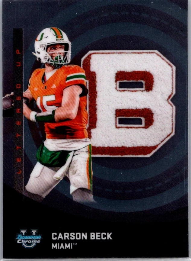 This is a nice example of a 2025 Bowman University Chrome #LU-1 Carson Beck Lettered Up