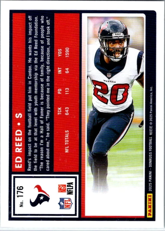 This is a nice example of a 2025 Donruss #176 Ed Reed Press Proofs Green