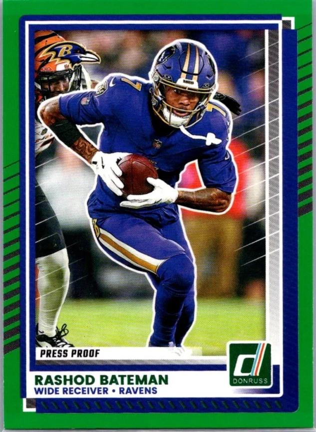 This is a nice example of a 2025 Donruss #25 Rashod Bateman Press Proofs Green