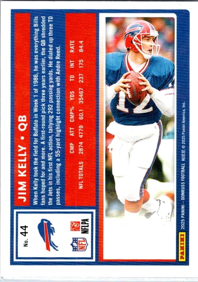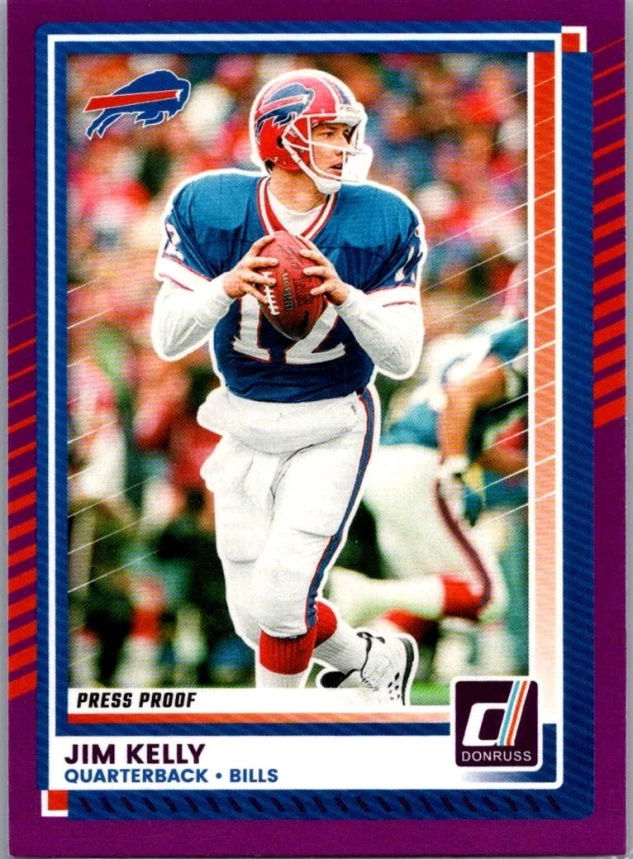 This is a nice example of a 2025 Donruss #44 Jim Kelly Press Proofs Purple