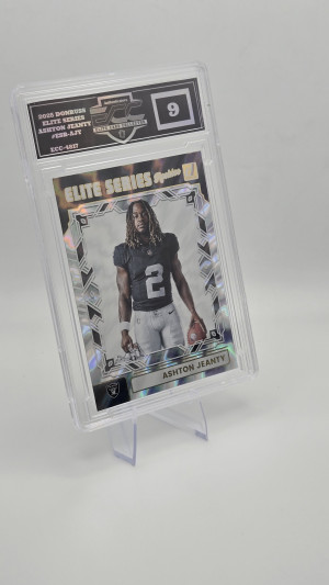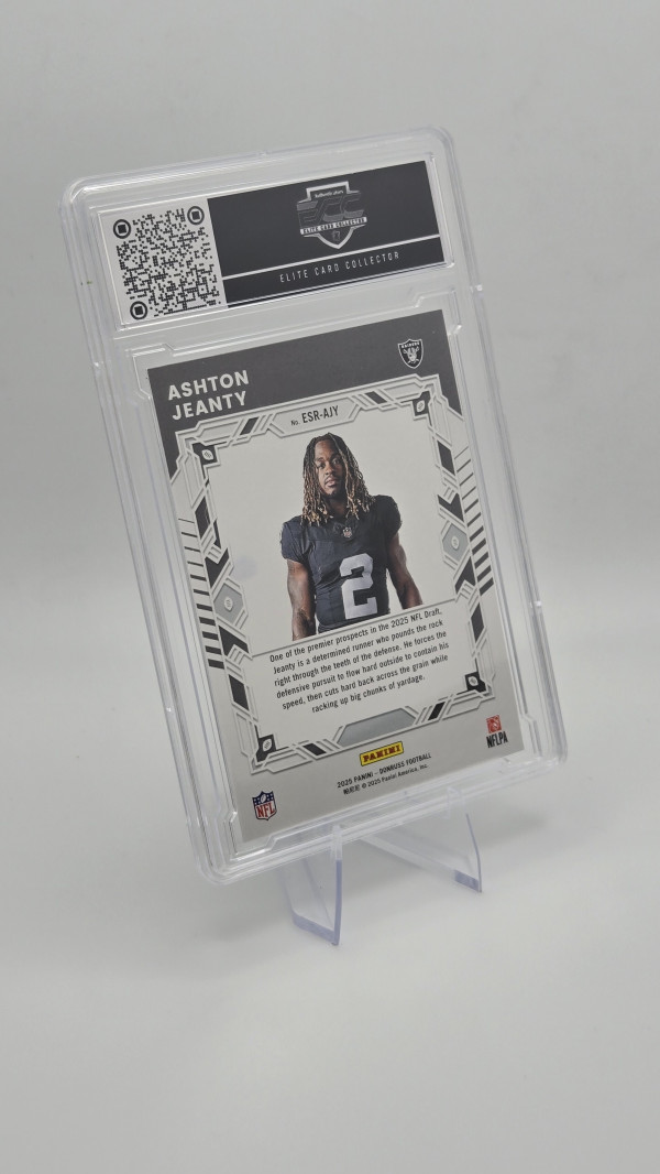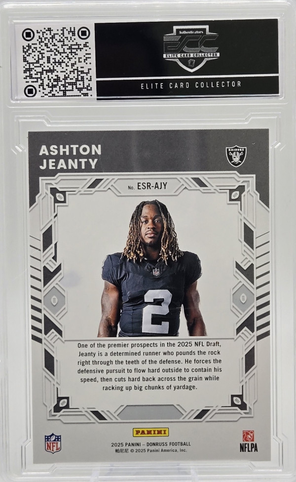 The product is a 2025 Donruss Ashton Jeanty Elite Series Rookies graded as MINT 9. This football trading card features Jeanty, a rookie player from the Las Vegas Raiders, in the Elite Series Rookies set. Manufactured by Donruss, this original card is authenticated by the manufacturer and is a must-have for fans and collectors looking to add a valuable piece to their collection.
