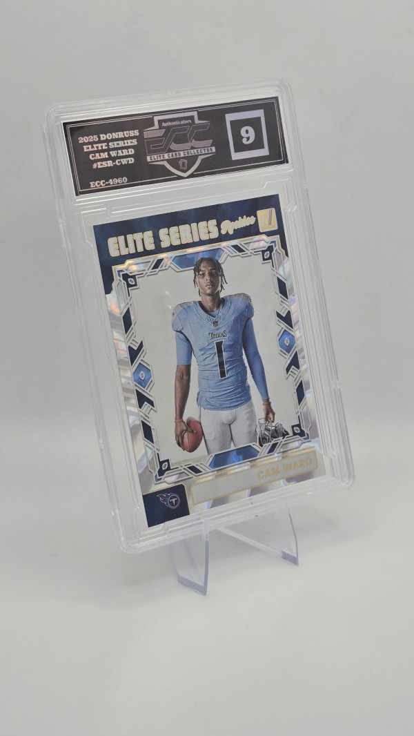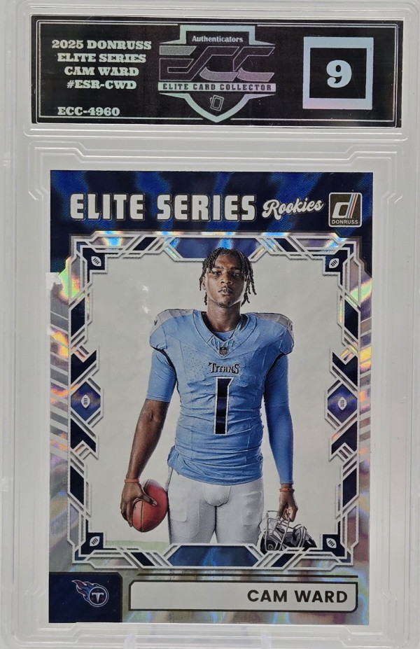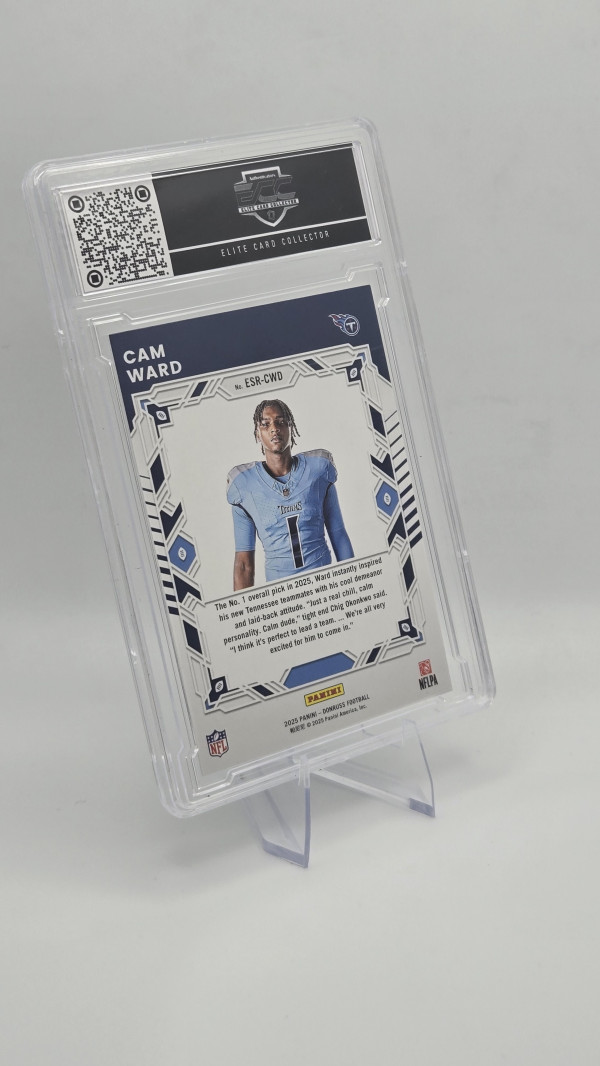 The product is a 2025 Donruss Cam Ward ELITE SERIES Rookie RC trading card from the Tennessee Titans, featuring the player as the #1 pick in the National Football League (NFL). This original card is made of card stock with a thickness of 20 Pt. and is part of the Elite Series set, making it a valuable addition for football card collectors. The card is authenticated by Donruss and graded by Elite Card Collector, adding to its authenticity and appeal to fans of the Tennessee Titans and football trading cards.