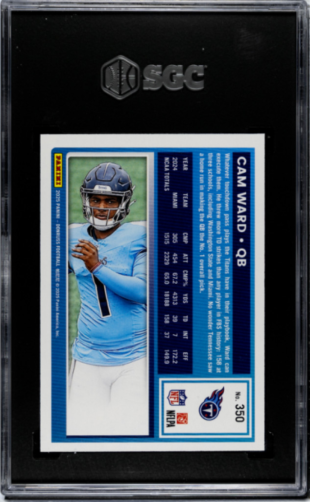 The 2025 Panini Donruss Rated Rookie Cam Ward #350 trading card is a highly sought-after collectible for fans of the National Football League. This graded card features Cam Ward from the Tennessee Titans, with a grade of 9.5 from Sportscard Guaranty Corporation (SGC). With its iconic design and limited availability, this card is a valuable addition to any sports trading card collection.