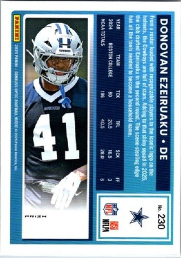 This is a nice example of a 2025 Donruss Optic #230 Donovan Ezeiruaku Rocket