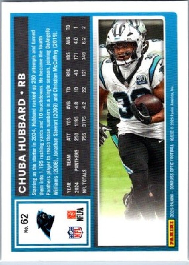 This is a nice example of a 2025 Donruss Optic #62 Chuba Hubbard