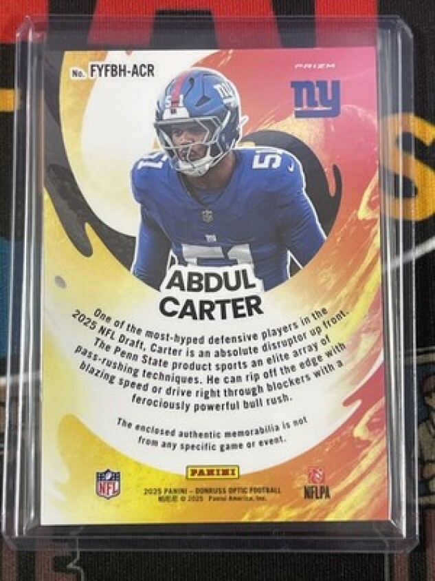 This is a nice example of a 2025 Donruss Optic #FYFBH-ACR Abdul Carter First Year Fresh Blue Hyper