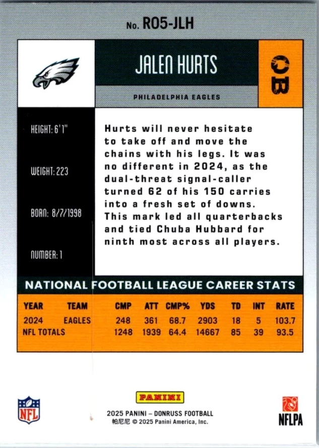 This is a nice example of a 2025 Donruss #R05-JLH Jalen Hurts Retro 2005
