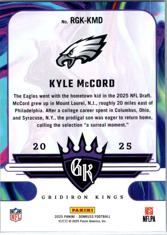 This is a nice example of a 2025 Donruss #RGK-KMD Kyle McCord Rookie Gridiron Kings