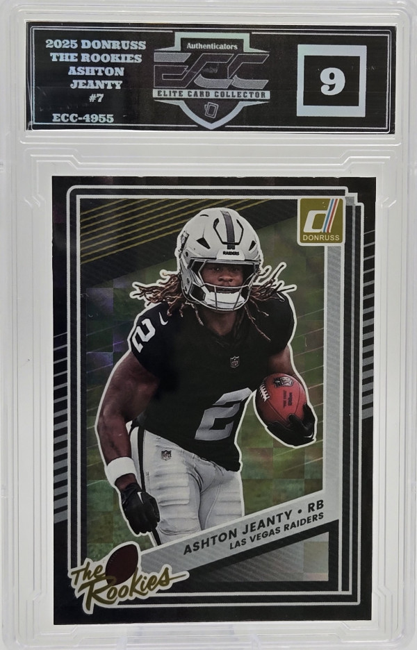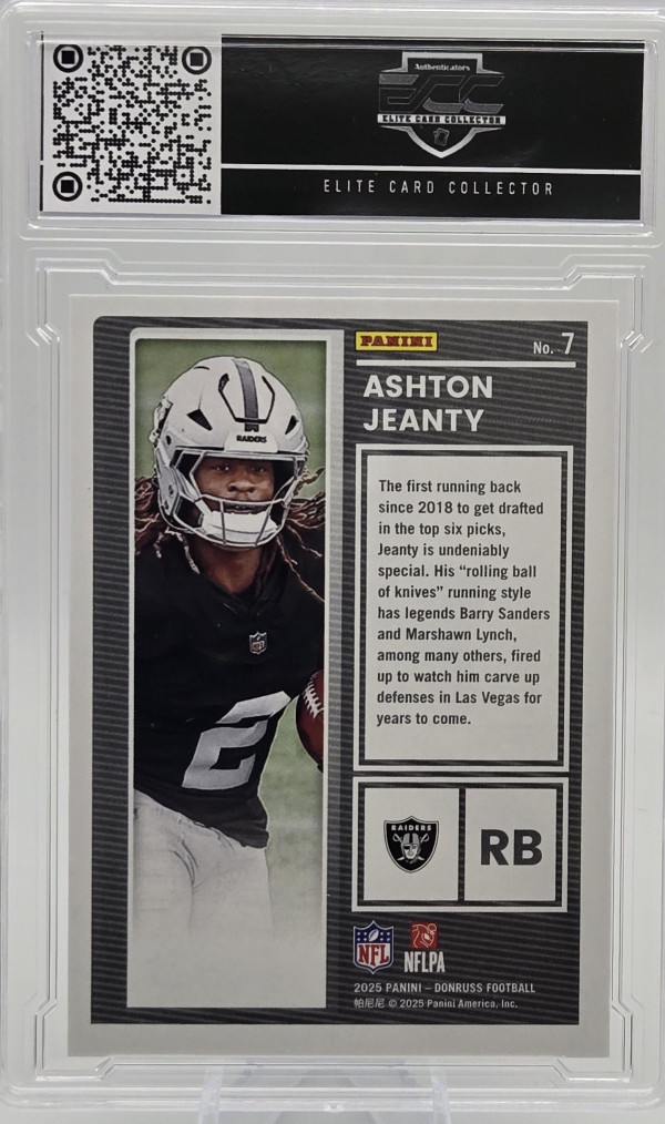 The product is a 2025 Donruss The Rookies Ashton Jeanty trading card featuring the player from the Las Vegas Raiders (#7). This standard-sized card is an original licensed reprint from the Panini manufacturer, made of card stock with a thickness of 20 Pt. It is part of the The Rookies insert set and showcases Jeanty as a rookie in the National Football League (NFL) for the 2025 season. This collectible item would be a valuable addition to any football card collection, especially for fans of the Raiders or Jeanty.