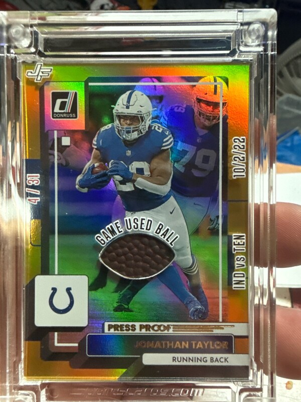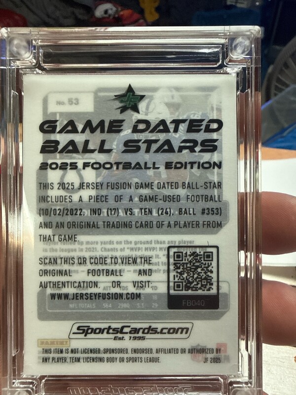 This is a game used ball patch from 10/02/22 Colts vs Titans. On the back of the card is a QR code. That will show you the ball and authentication
