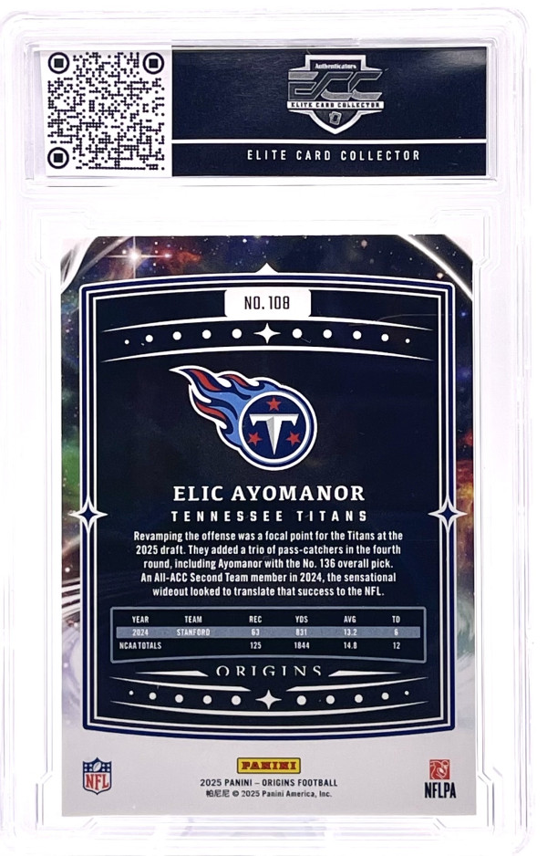 .The product is a 2025 Panini Origins football trading card featuring rookie player Elic Ayomanor from the Tennessee Titans. This card is graded a 9 by a professional grader and is part of the base set for the 2025 season. With a card number of 108, it is a valuable collectible for fans and collectors of the National Football League (NFL). The card is a key addition to any football card collection, showcasing the up-and-coming talent of Elic Ayomanor in his rookie year.