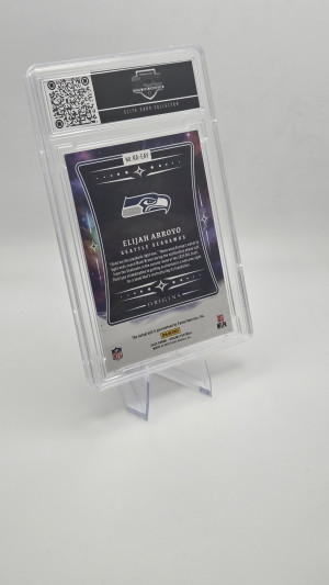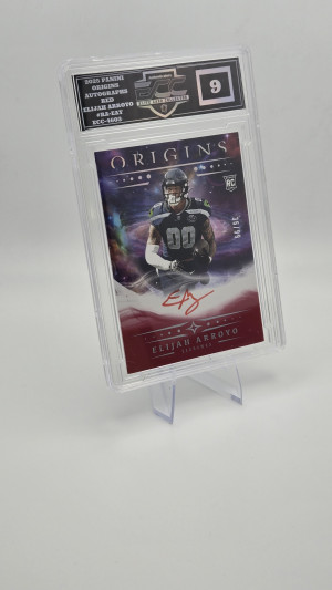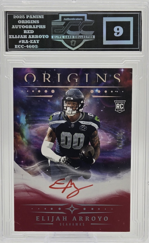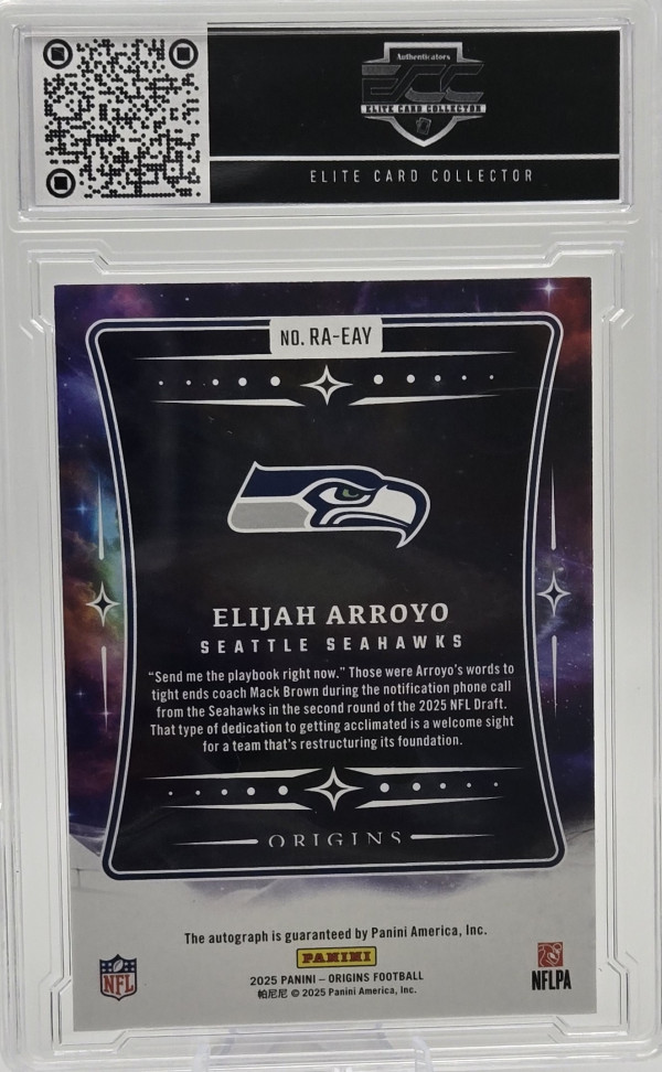 The product is a rare 2025 Panini Origins Elijah Arroyo rookie autograph card with a red parallel numbered out of 99. This mint 9 graded card features a label or sticker autograph from the Seattle Seahawks player, authenticated by Panini. A must-have for collectors, this original card is a part of the Rookie Autographs Red insert set, perfect for fans of football and the National Football League. Displaying the player's name, team, and autograph, this card is a valuable addition to any sports trading card collection.
