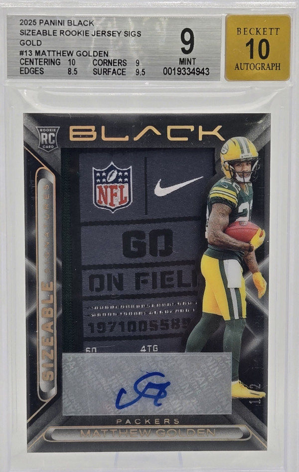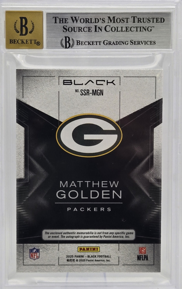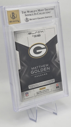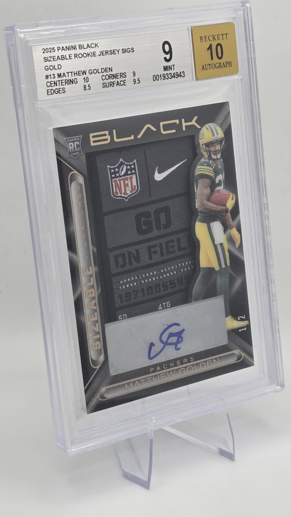 The product is a 2025 Panini Black trading card featuring an autograph from Matthew Golden, a player in the National Football League (NFL). This card is part of the Sizeable Rookie Jersey Signatures insert set and has a print run of only 2, making it a highly sought-after collectible. The card is serial numbered, featuring a gold parallel variety, and comes with Panini Authentic autograph authentication, adding to its value and authenticity. This rare and limited edition card is a must-have for any football card collector.