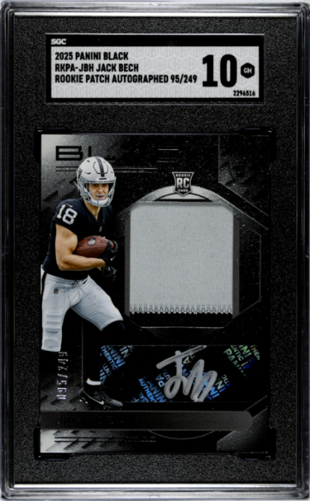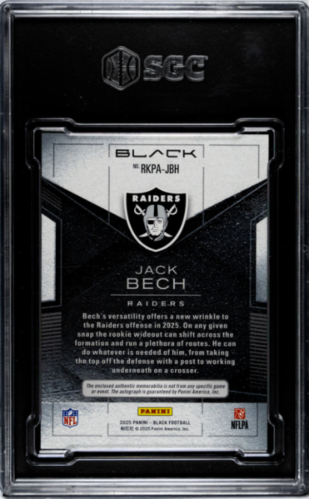 The product is a 2025 Panini Black rookie patch autograph card featuring Jack Bech of the Las Vegas Raiders. The card is autographed by Bech and authenticated by Panini Authentic. It is a standard-sized card made of 20 Pt. card stock, with a patch parallel variety and serial numbering. The card is graded as 10 by the Sportscard Guaranty Corporation (SGC) and is an original release in the National Football League (NFL) for the 2025 season. This highly collectible item is a must-have for football card enthusiasts and fans of the Raiders.