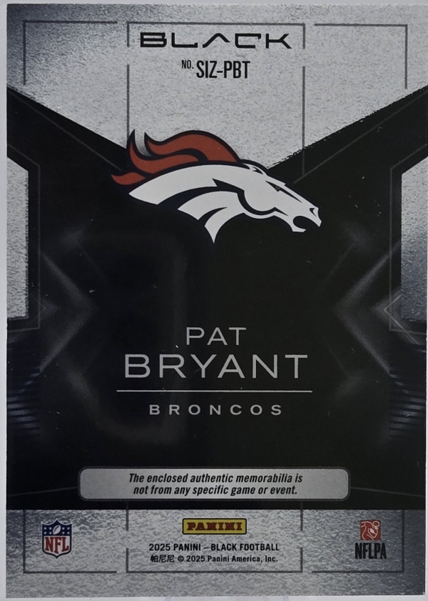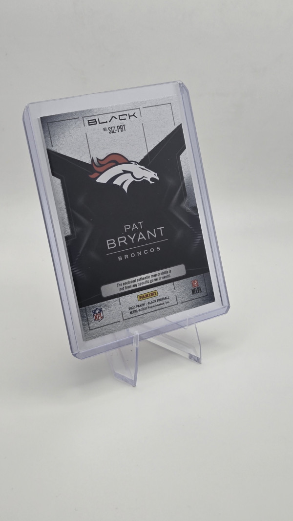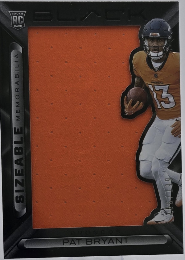 The 2025 Panini Black Sizable Rookie Memorabilia card featuring Pat Bryant from the Denver Broncos is a highly sought-after collectible with a limited print run of only 199 copies. This football trading card contains a piece of memorabilia from the rookie player, making it a valuable addition to any fan's collection. With the card being part of the Sizeable Rookie Memorabilia insert set, it offers a special and unique aspect to NFL enthusiasts looking to own a piece of history from the 2025 season.