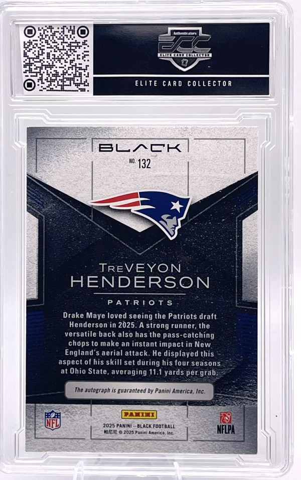 The product is a 2025 Panini Black football trading card featuring rookie Treveyon Henderson from the New England Patriots. This particular card is an autograph parallel with a limited print run of 199. Graded as a 9, this card is a valuable addition to any football card collection for fans of the National Football League.