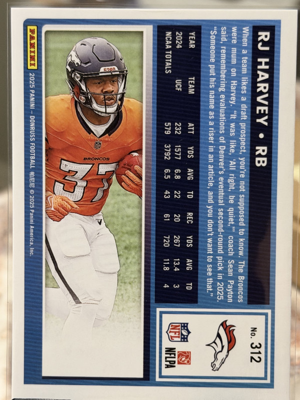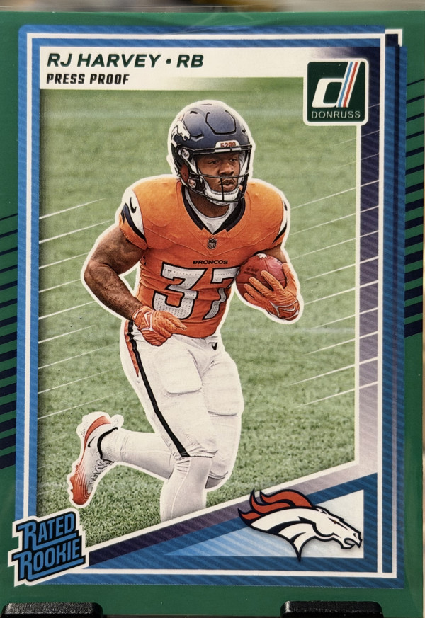 2025 Panini Donruss - Rated Rookie RJ Harvey #312 Press Proof Green (RC)