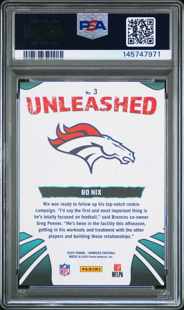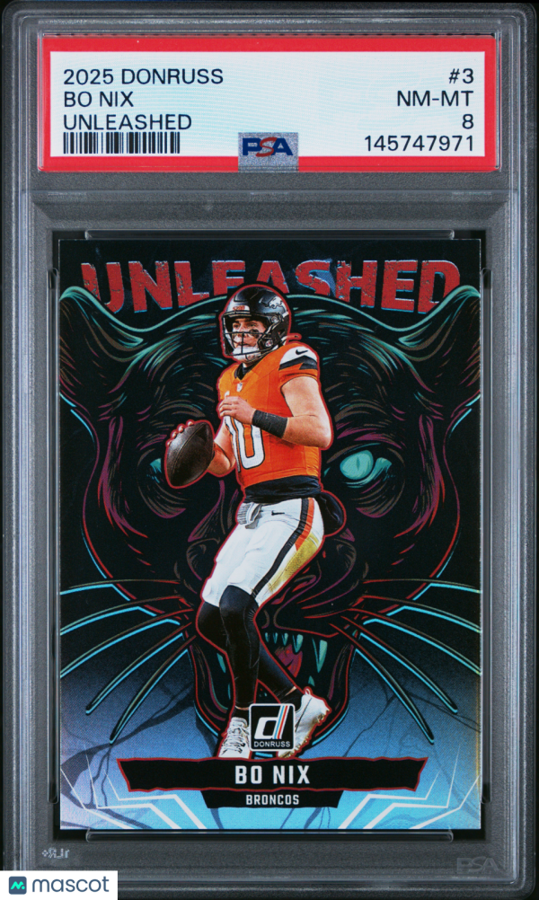 You are purchasing a 2025 Panini Donruss Unleashed Bo Nix #3 PSA 8. You will receive the exact item in the photographs. Thank you for looking.