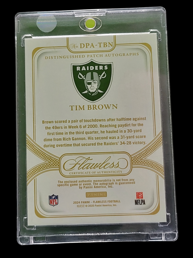 You are purchasing a 2025 Panini Flawless Football Tim Brown #DPA-TBN Distinguished Patch Autographs Patch 04/15 Memorabilia. You will receive the exact item in the photographs. Thank you for looking.