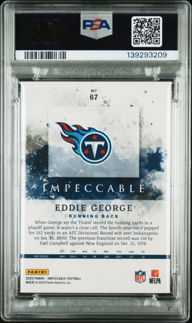 The product is a 2025 Panini Impeccable trading card featuring Eddie George of the Tennessee Titans. This card is part of a limited print run of 80 and is graded by Professional Sports Authenticator (PSA) as an 8. It is a base card from the set and is serial numbered, making it a valuable collectible for fans of both Eddie George and the NFL.