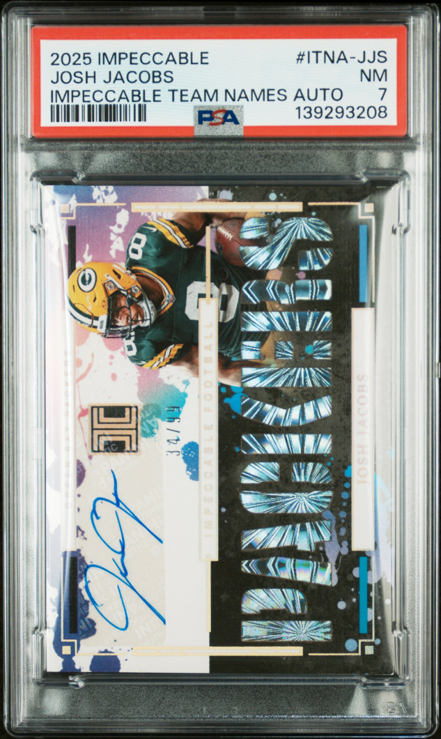 The product is a 2025 Panini Impeccable Football trading card featuring an autograph from Josh Jacobs of the Green Bay Packers. This particular card is numbered /99, making it a rare and collectible item for fans of the NFL and football trading cards. Authenticated by Professional Sports Authenticator (PSA) with a grade of 7, this card is a valuable addition to any sports memorabilia collection for enthusiasts of the sport and player alike.