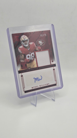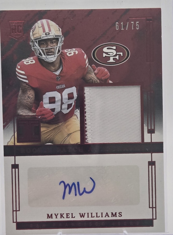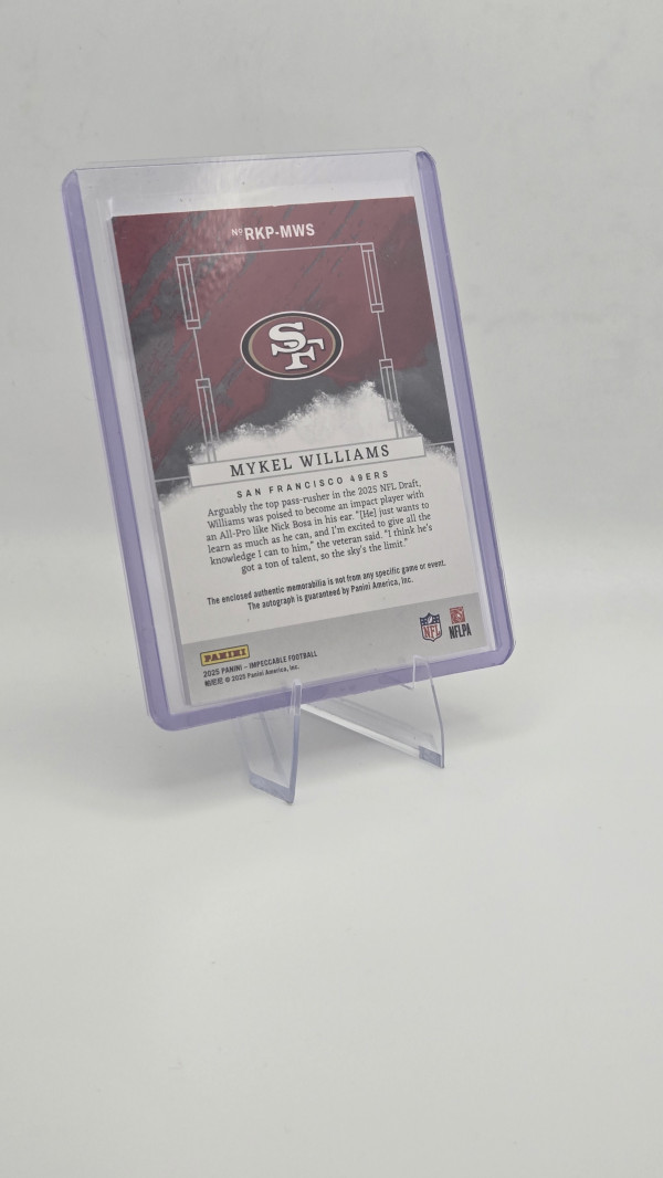 The product is a 2025 Panini Impeccable Mykel Williams Rookie Patch Auto Red /75 trading card featuring the autograph of Mykel Williams from the Tennessee Titans. This card is part of the Rookie Patch Autographs insert set and is authenticated by Panini Authentic. The card is serial numbered, making it a rare collectible for football fans and trading card enthusiasts. With only 75 copies in existence, this limited edition card is a valuable addition to any sports memorabilia collection.
