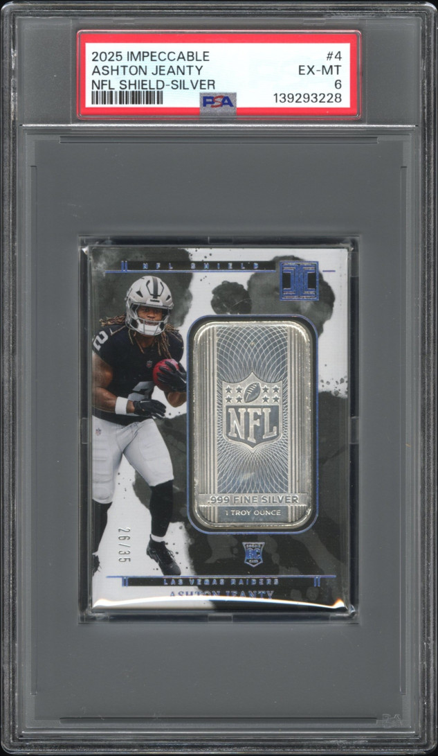 The 2025 Panini Impeccable NFL Shield Ashton Jeanty NFL Shield-Silver Bar 26/35 is a highly collectible sports trading card featuring a hard-signed autograph from NFL player Ashton Jeanty. This original card, manufactured by Panini, is a limited edition piece with a grade of 6 from Professional Sports Authenticator (PSA). The card is made of high-quality card stock and showcases the player in his Las Vegas Raiders uniform. A valuable addition to any football trading card collection, this item is a must-have for fans of the National Football League.