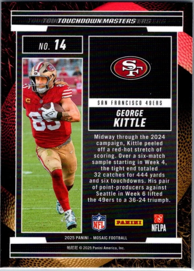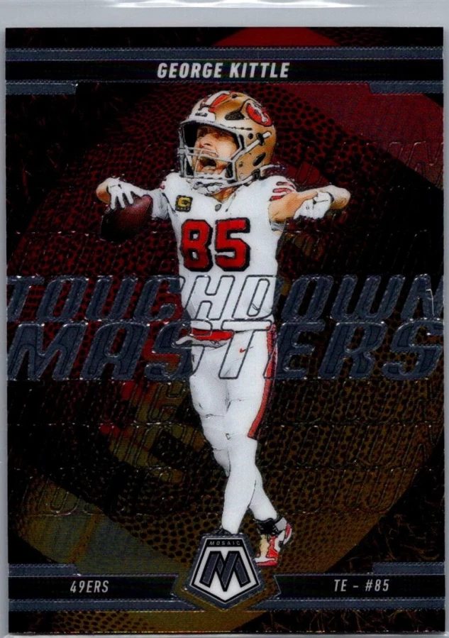 This is a nice example of a 2025 Panini Mosaic #14 George Kittle Touchdown Masters Mosaic