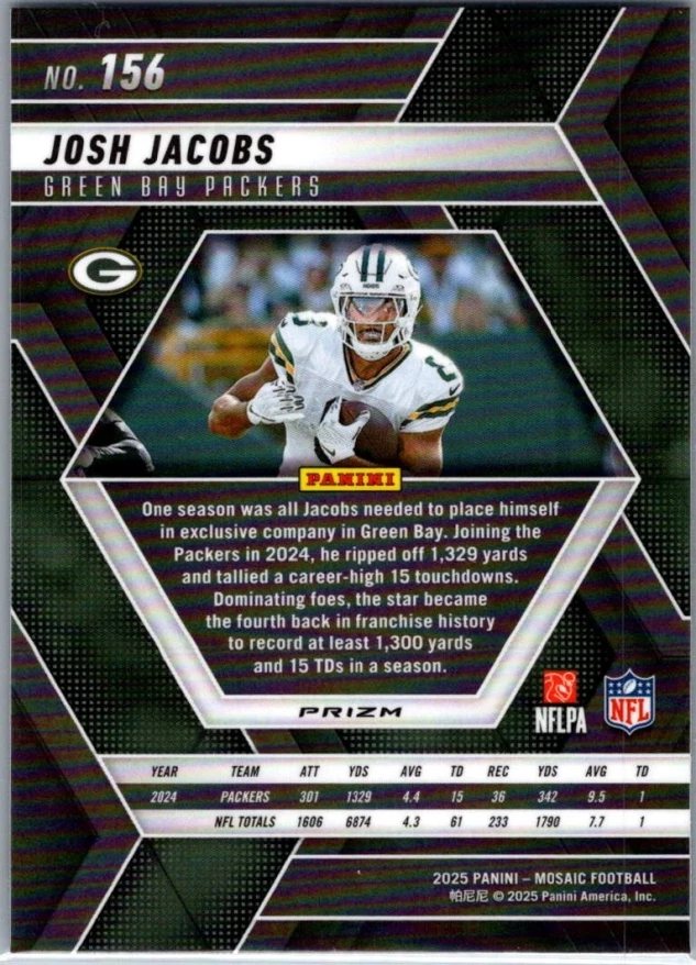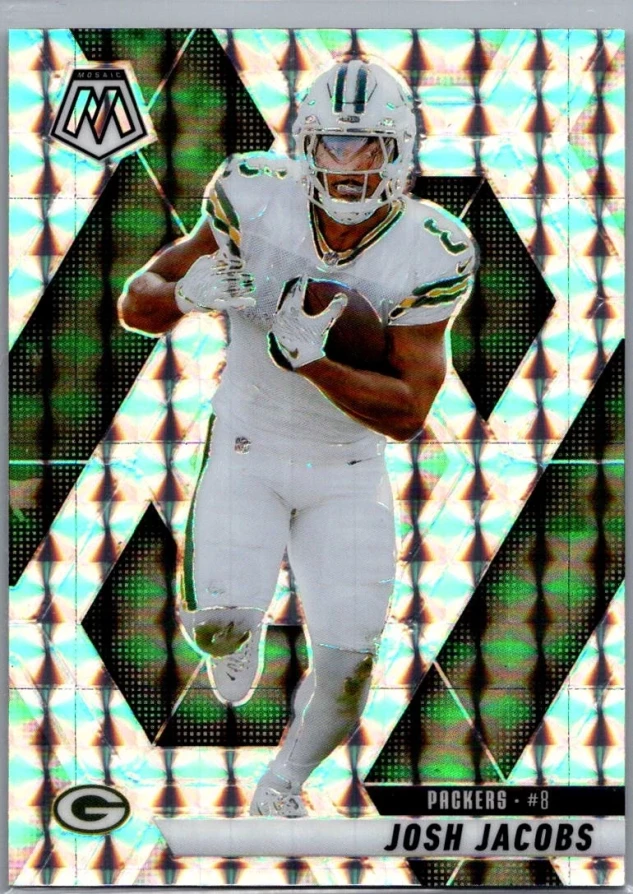 This is a nice example of a 2025 Panini Mosaic #156 Josh Jacobs Mosaic