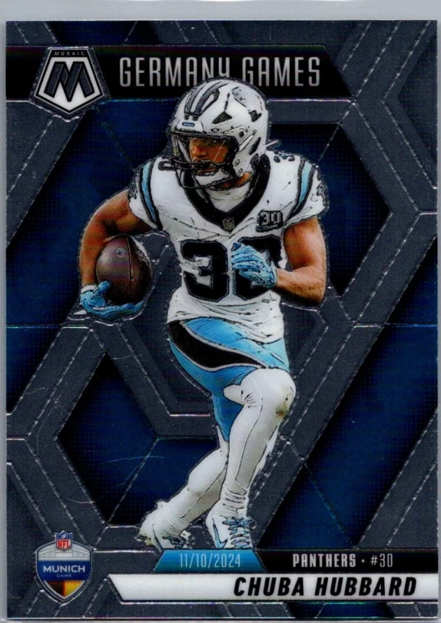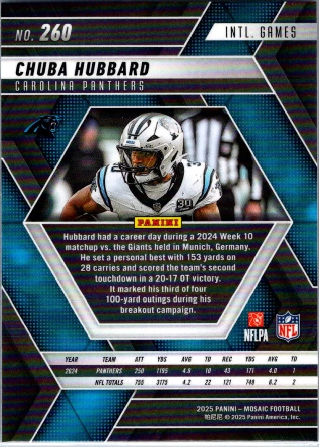 This is a nice example of a 2025 Panini Mosaic #260 Chuba Hubbard