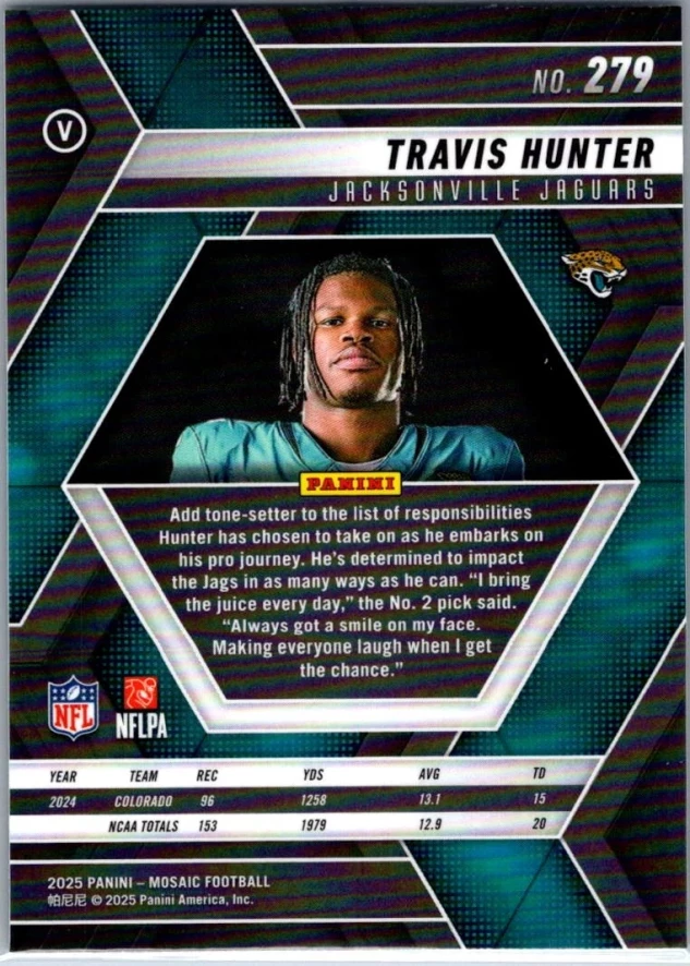 This is a nice example of a 2025 Panini Mosaic #279 Travis Hunter