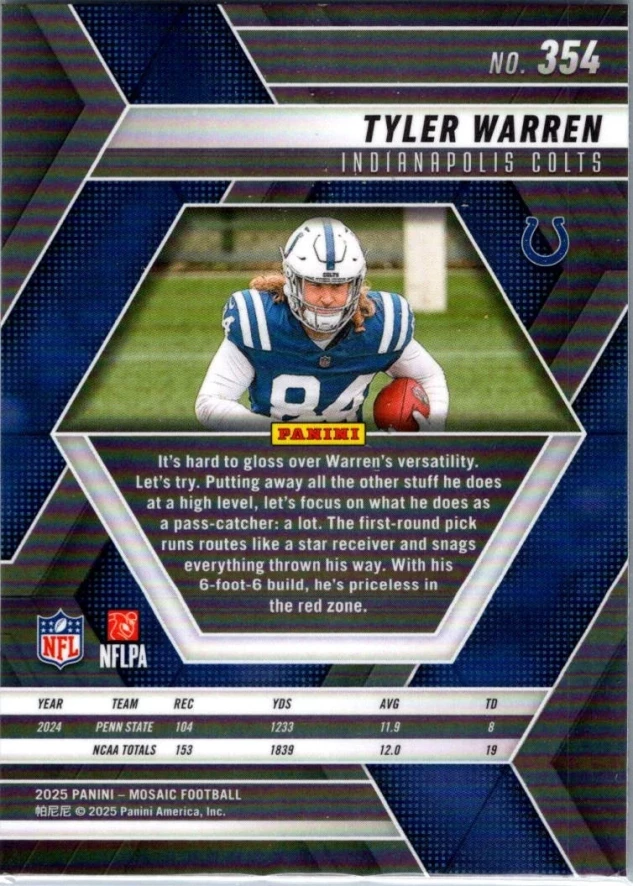 This is a nice example of a 2025 Panini Mosaic #354 Tyler Warren