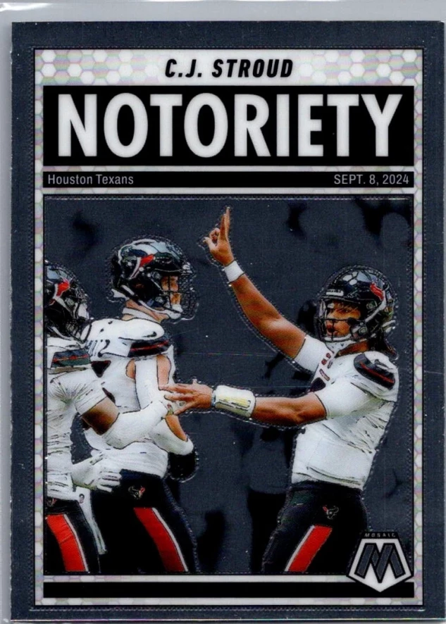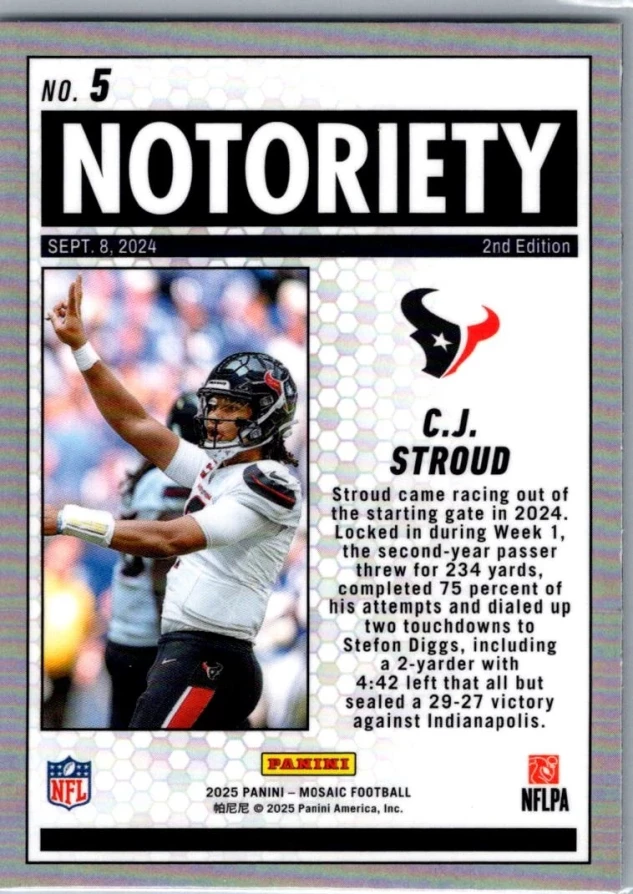This is a nice example of a 2025 Panini Mosaic #5 C.J. Stroud Notoriety