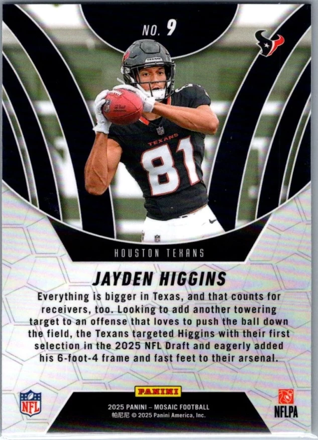 This is a nice example of a 2025 Panini Mosaic #9 Jayden Higgins Elevate