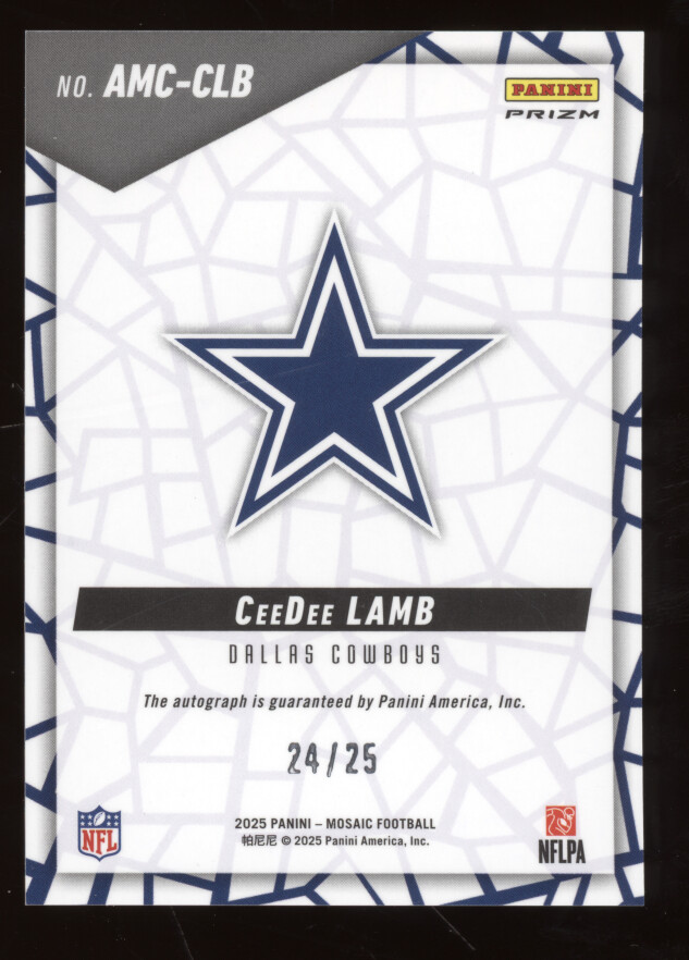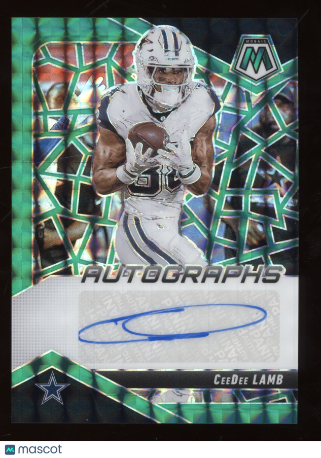 You are purchasing a 2025 Panini Mosaic Football CeeDee Lamb #AMC-CLB Choice Fusion Green Black Autograph 24/25. You will receive the exact item in the photographs. Thank you for looking.