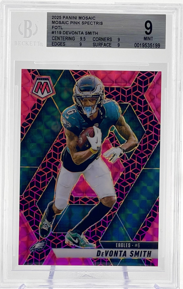 The 2025 Panini Mosaic Pink Spectris card featuring #119 DeVonta Smith from the Philadelphia Eagles is a highly sought-after sports trading card for football fans. This standard-sized card is part of the base set and is manufactured by Panini, with an autograph from Jakobi Meyers. With a 20 Pt. card thickness and graded as a 9 by Beckett Grading Services (BGS), this original card is a valuable addition to any sports memorabilia collection. Displaying features such as the National Football League (NFL) logo and the player's image, this card is a must-have for collectors looking to celebrate the 2025 season.