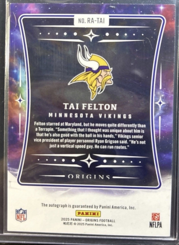 2025 Panini Origins Purple RC ~ NFL Tai Felton #RA-TA1 On-Card Auto (Vikings) (RC)